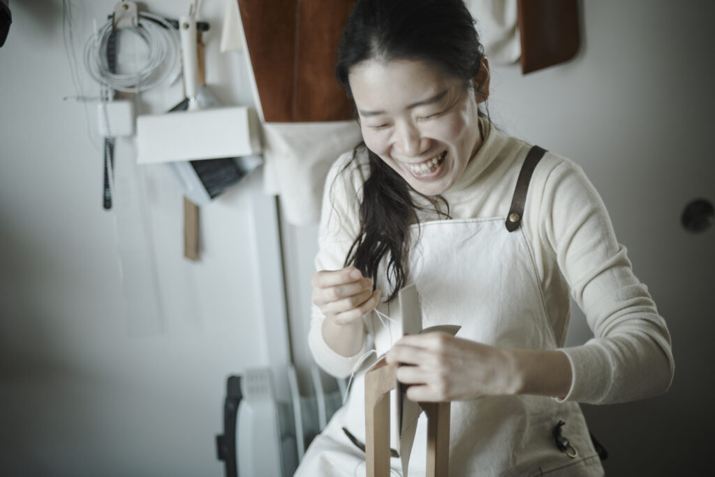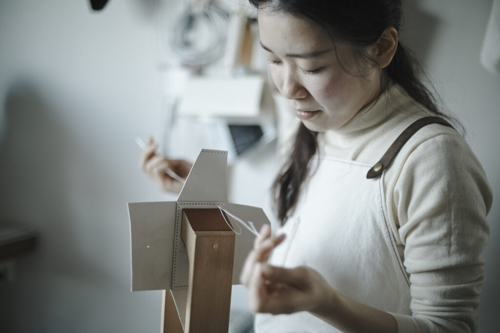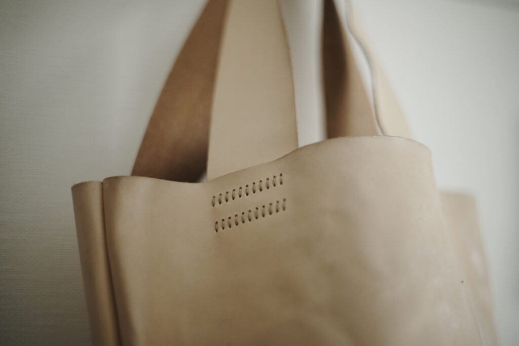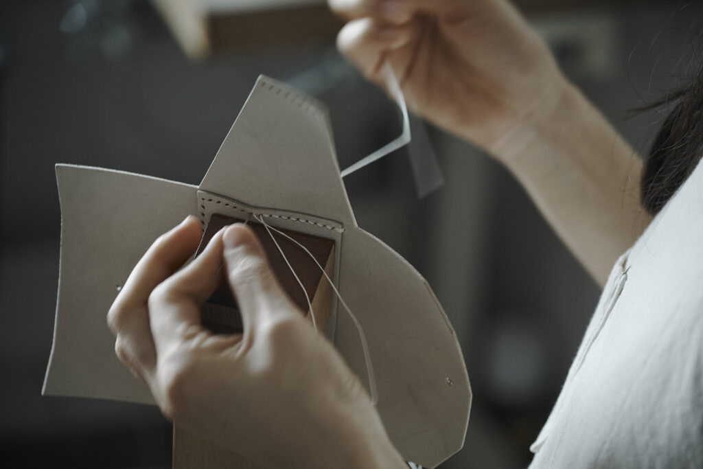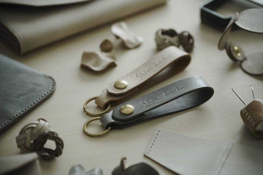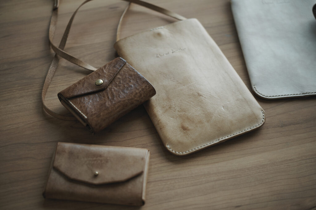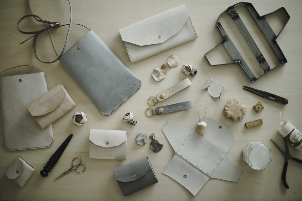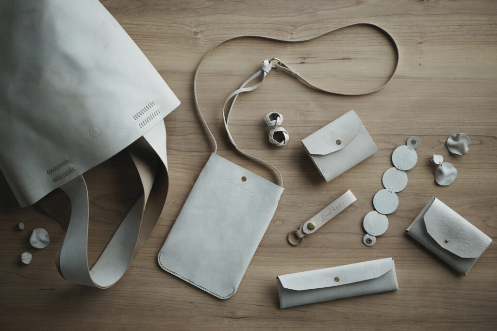 つくる、つかう、愛おしむをコンセプトに自然の中で自ずと生まれてくる形を皮で表現されている