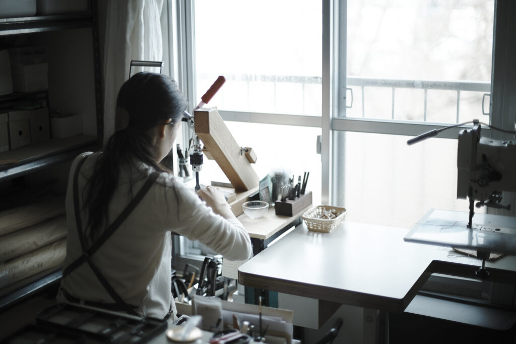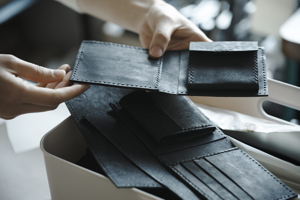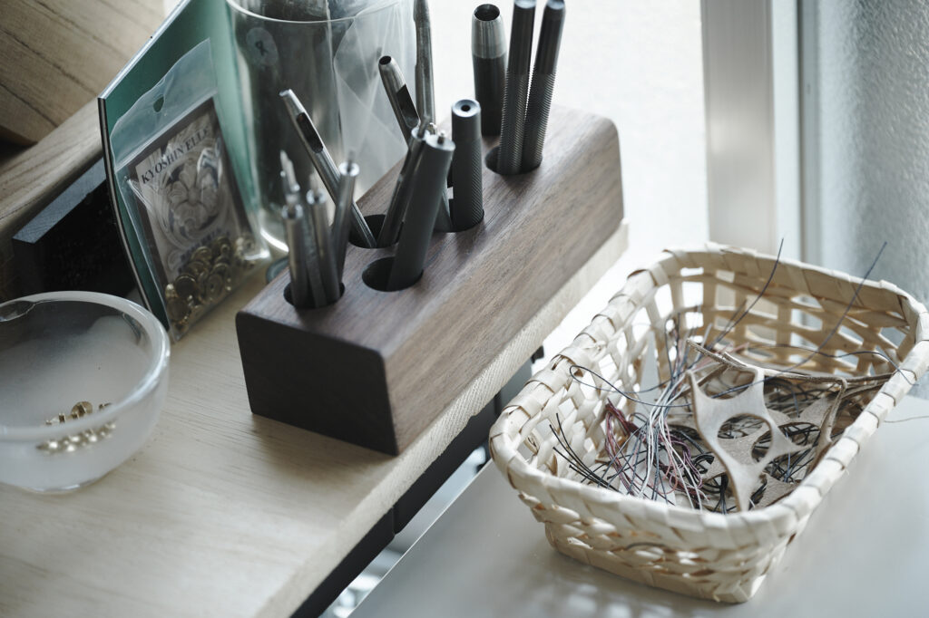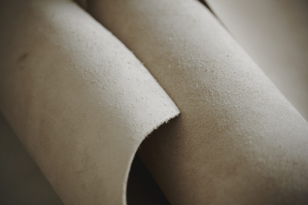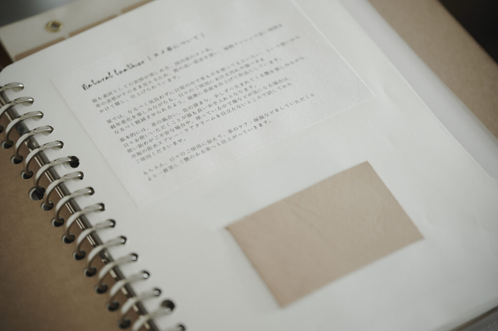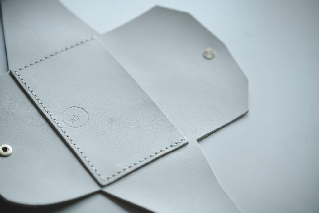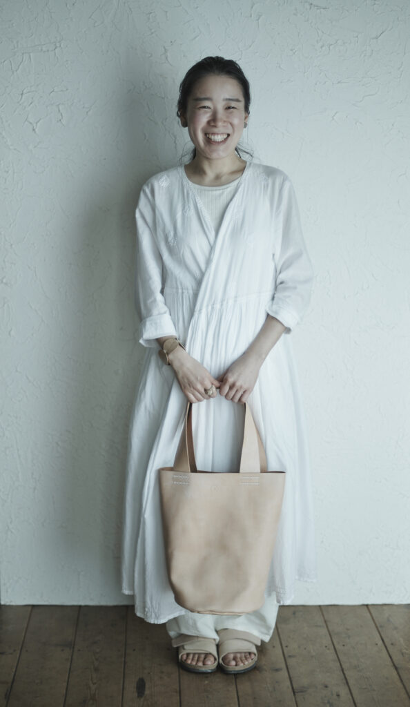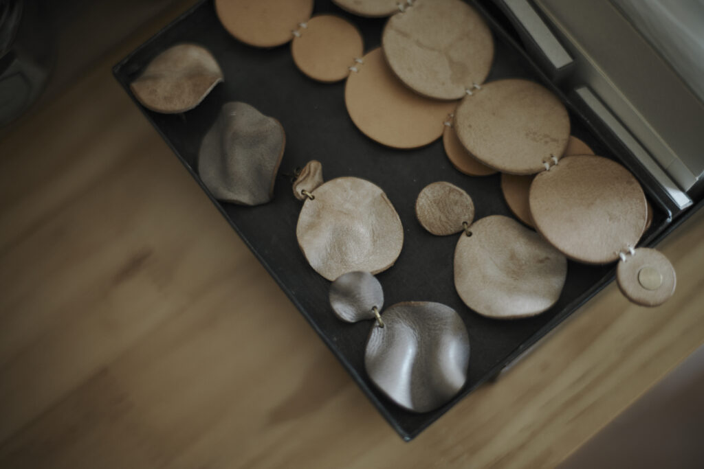 つくる、つかう、愛おしむをコンセプトに自然の中で自ずと生まれてくる形を皮で表現されている