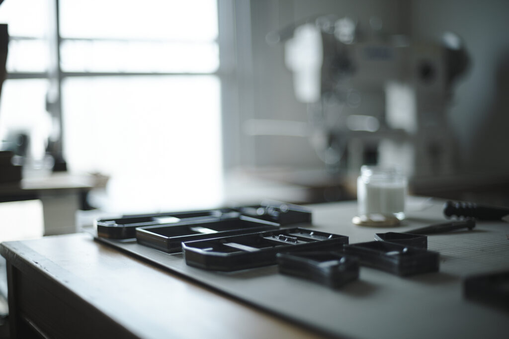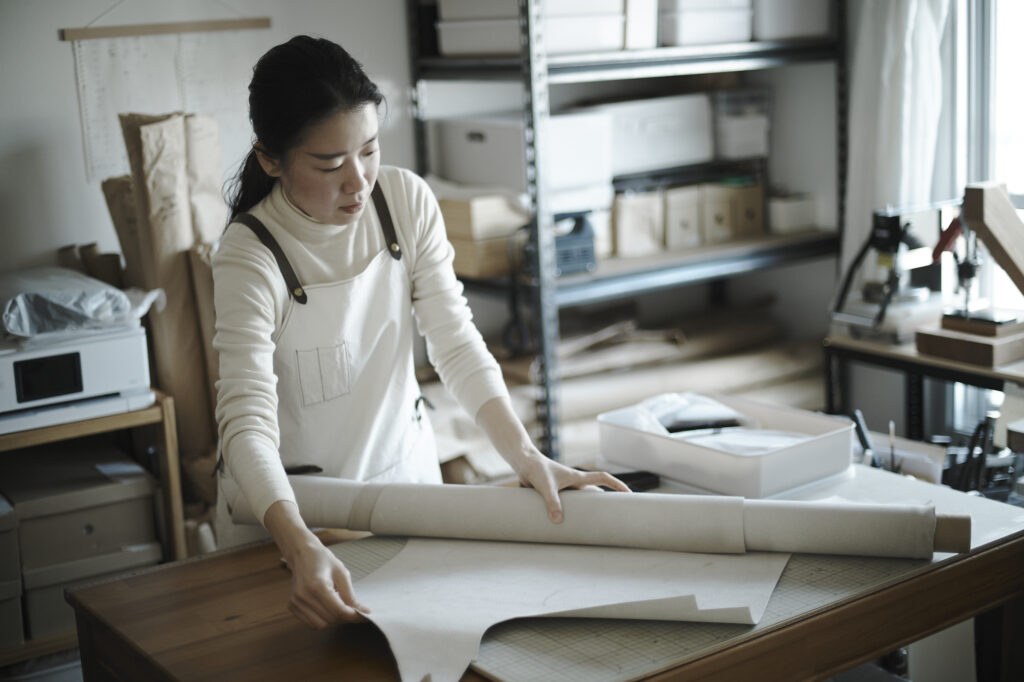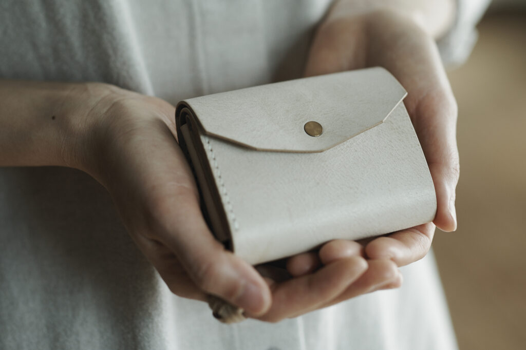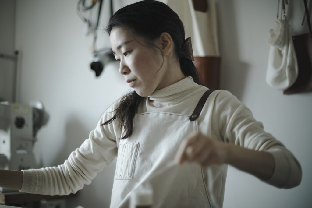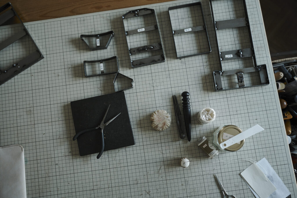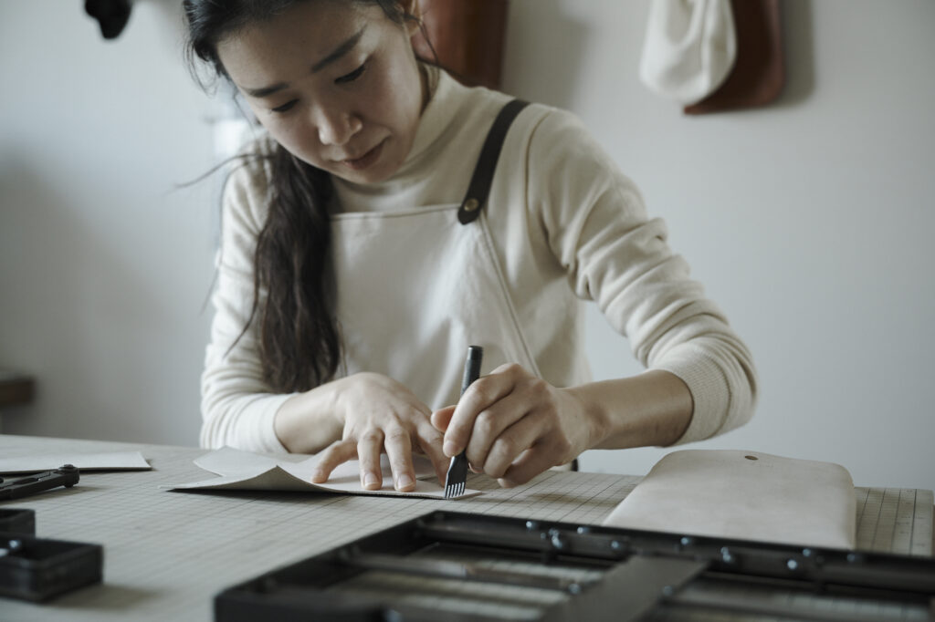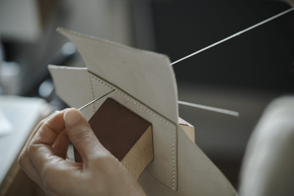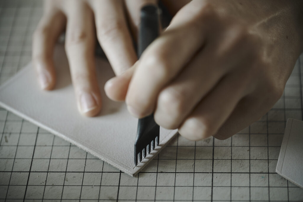 つくる、つかう、愛おしむをコンセプトに自然の中で自ずと生まれてくる形を皮で表現されている
